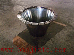 鉬導(dǎo)流筒的形狀是上開口大,下開口小喇叭形,上開口因單晶爐生產(chǎn)廠家不同而有多種款式,其規(guī)格有16寸、18寸、22寸等。鉬導(dǎo)流筒的生產(chǎn)加工,一般采用0.8-2.0mm高溫鉬板,按圖紙尺寸整片切割成扇形,加熱卷成喇叭形狀,鉚接或焊接,最后校正。為了節(jié)省成本,也有用鉬片拼接加工生產(chǎn)鉬導(dǎo)流筒,鉚接處比較多,影響使用壽命。 成品鉬導(dǎo)流筒,成品表面光潔,上下口徑同心一致,尺寸精確,與石墨導(dǎo)流筒能緊密切合,成品單重3-10公斤。 |